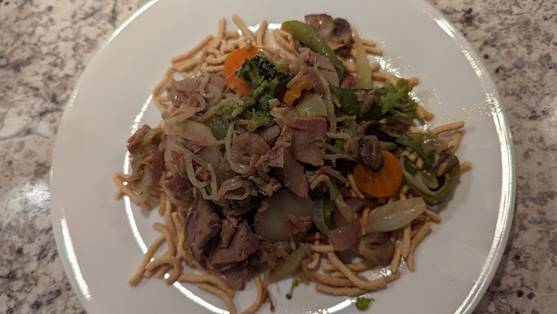 One of the great things about chop suey is that it accepts leftovers very well without sacrificing taste. In this case, I had a couple of pieces of pork tenderloin leftover from my previously posted “Grilled Pork Tenderloin” recipe. But any pork will work. I sometimes use cooked country ribs. I planned on shredding the meat with a couple of forks to make it like pulled pork, but the meat was cold from being in the fridge and didn’t cooperate very well, so I opted to take an easier route and thinly slice it instead.