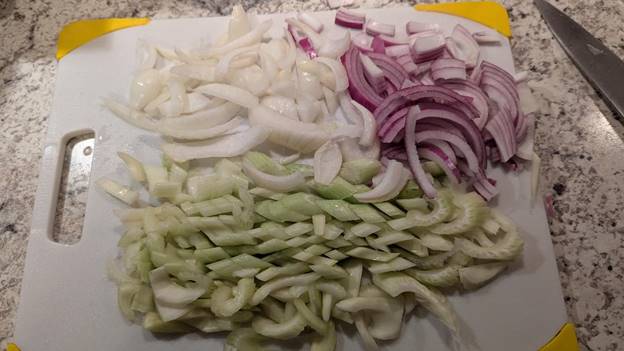 I set the meat aside to let it warm up to room temperature while chopping up the celery and onions. I hope you can see that I diagonally sliced the celery. That makes it look more Asian. It may also help with the tenderness.