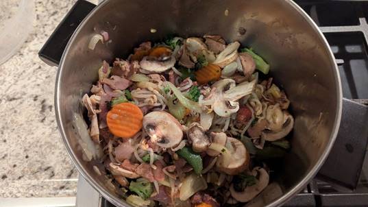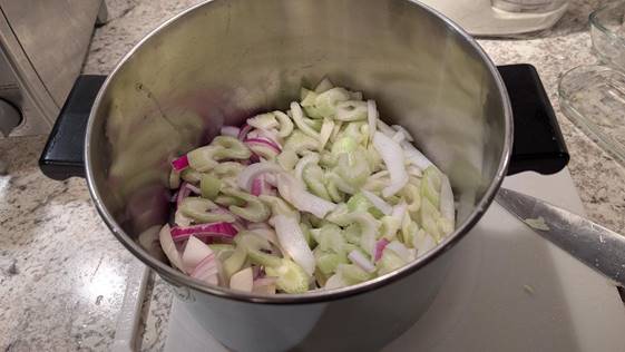 For most recipes, I would sauté the celery and onions in a skillet, but for chop suey, I like to sauté them right in the soup pot, making this a one-pot meal. Just add a little olive oil and sauté lightly, keeping in mind that they will continue to cook after adding the meats and veggies.